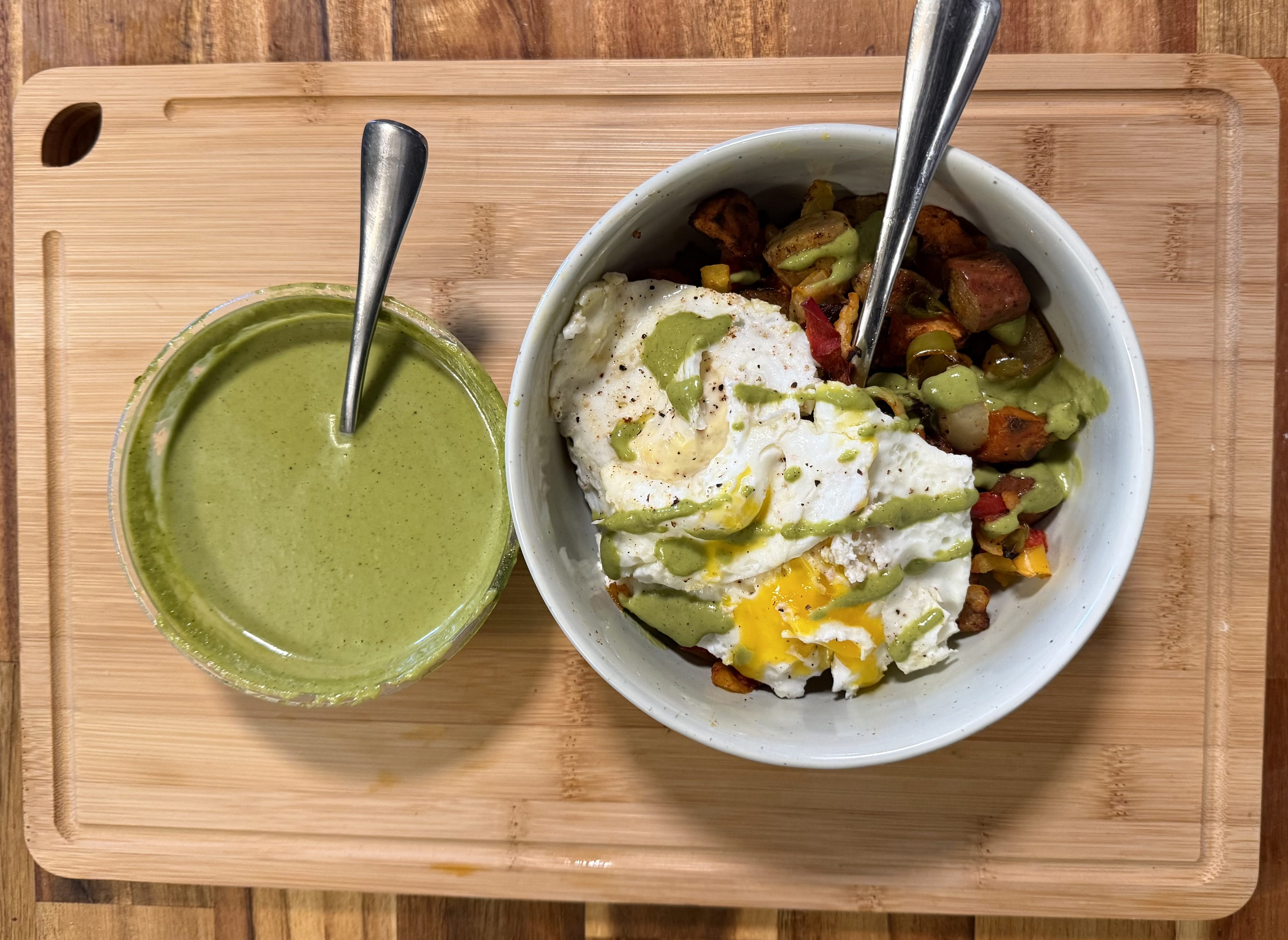 Pictured, you’ll see my go-to inspiration: the creamy jalapeño salsa from Tio Fun in Nashville, TN. Anytime I stop in for lunch or dinner, I always order an extra side of their signature green salsa—especially for leftover hash. It’s tangy, spicy, and ridiculously good. I’ve recreated my own version at home many times, and the flavor pairs perfectly with this hash, every single time.